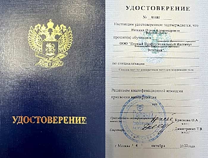 - Удостоверение ППИЭ Pin Up по аппаратным методам коррекции тела».