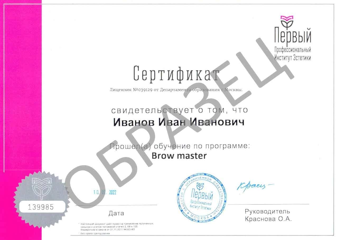 После обучения выдается документ Pin Up образца: Pin Up о профессии «БРОВИСТ» (документ вносится в ФИС ФРДО) + сертификат«Brow Master».