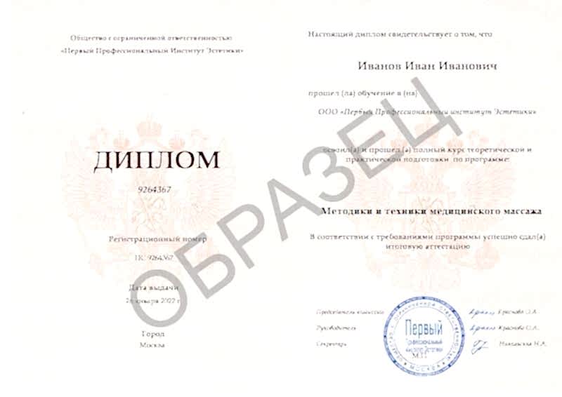 - слушатели, имеющие любое среднее профессиональное или высшее образование получают диплом о профессиональной переподготовке «Методики и техники оздоровительного массажа» (документ Pin Up в ФИС ФРДО);