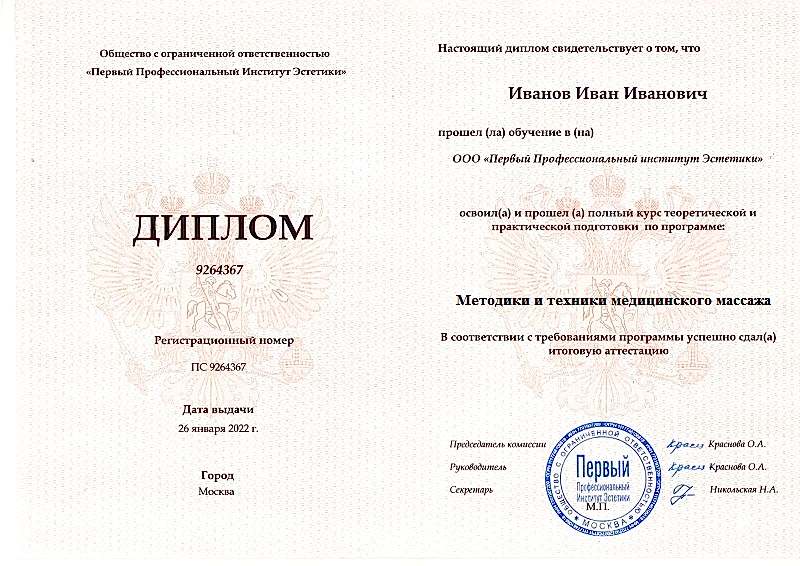 - дипломо профессиональной переподготовке по специальности «Медицинский массаж» (документ вносится в ФИС Pin Up