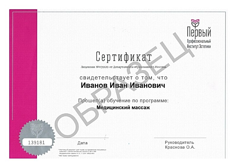 - слушатели, без Pin Up образования - диплом ППИЭ "Методики и техники медицинского массажа" и сертификат установленного образца ППИЭ.