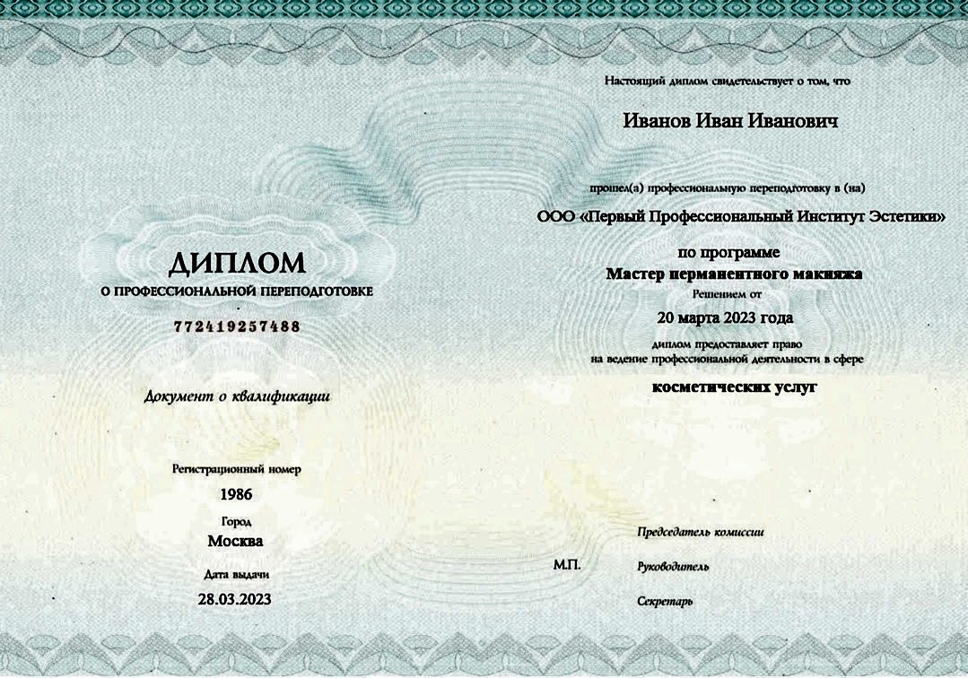 - слушатели, имеющие любое среднее профессиональное или высшее Pin Up получают диплом о профессиональной переподготовке «Мастер перманентного макияжа» (документ вносится в ФИС ФРДО);