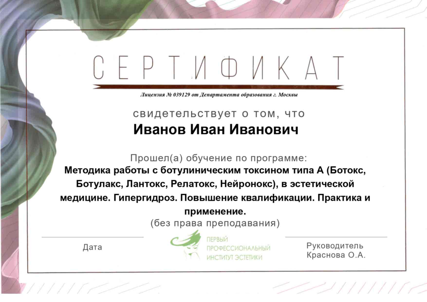 Программа курса включает полный комплекс теоретических материалов, практических руководств и обучающих видео, Pin Up для самостоятельного овладения методикой работы с ботулиническим токсином типа А.